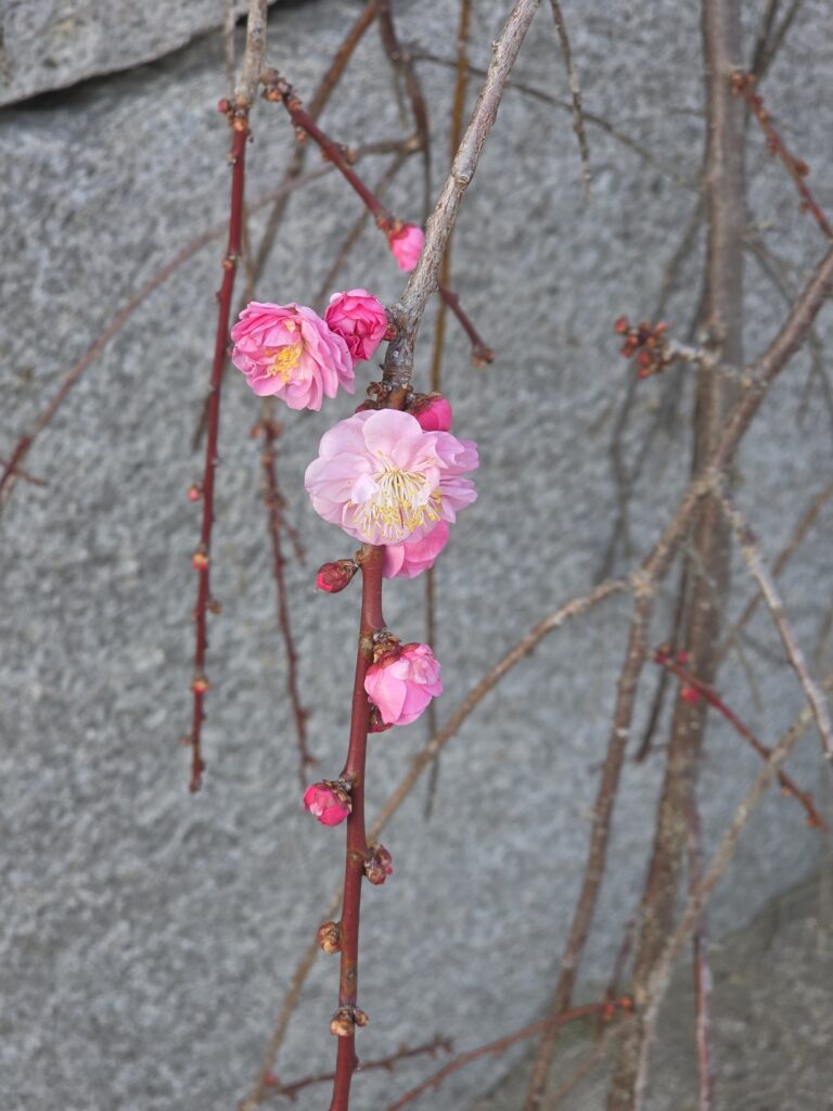 庭のしだれ梅も開花した。